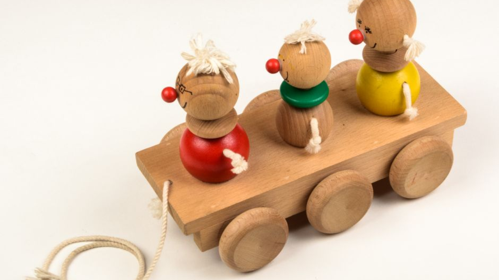 Het trekwagentje is enkel voorzien van een koord en vereist daarom dat het kind reeds goed kan lopen. Het kopje van de drie mannetjes maken een opwaartse beweging tijdens het voorttrekken van het wagentje.