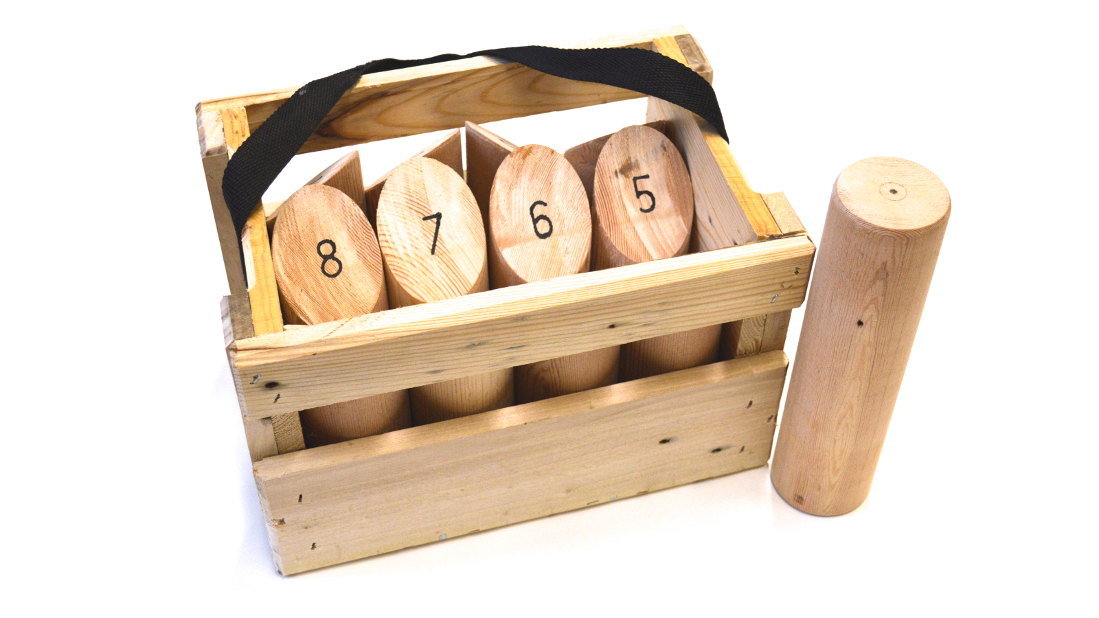 Spelers proberen met een houten werpstok genummerde kegels om te gooien om precies 50 punten te scoren.