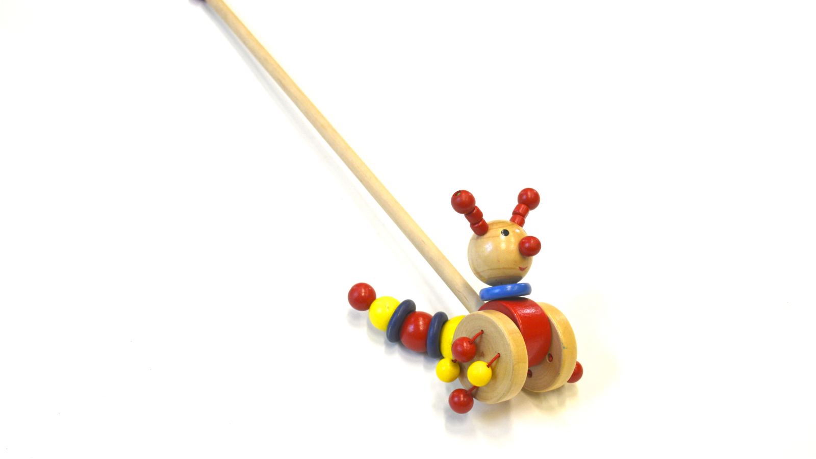 Dit speelgoed is een klassieke houten duwstok in de vorm van een rups.