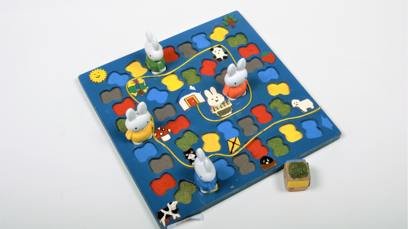 Inhoud: 1 blauw, 1 geel Nijntje - 12 voelbare kaartjes - 1 voelbare dobbelsteen - 1 voelbaar speelbord - spelregels