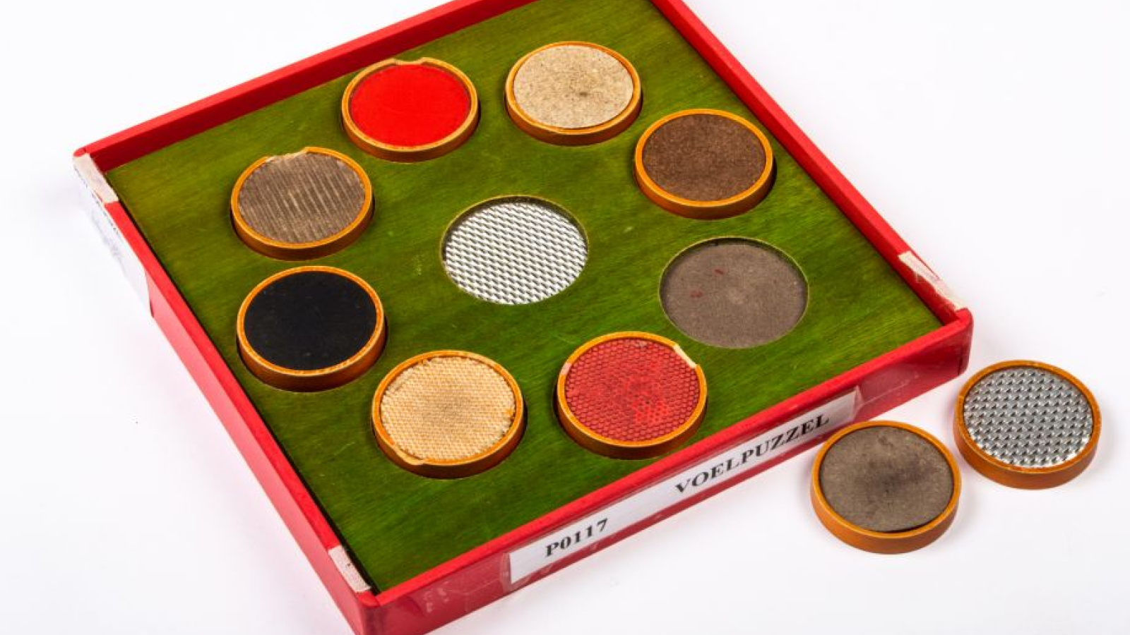 De grondplaat heeft negen uitsparingen tevens uit verschillende voelbare materialen vervaardigd. Leg de schijfjes in de juiste uitsparingen.