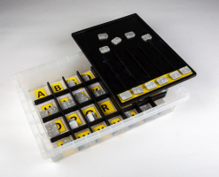 Sorteren van braille letters met een sorteerbordje voor 6 letters.