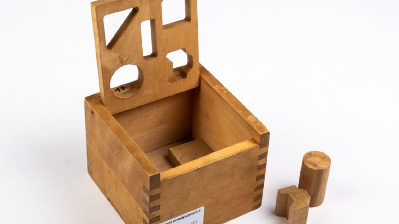 In het deksel zijn verschillende vormen uitgesneden. Probeer de blokjes in de juiste opening te steken. Het deksel kan opengeklapt worden om de vormpjes er terug uit te halen.