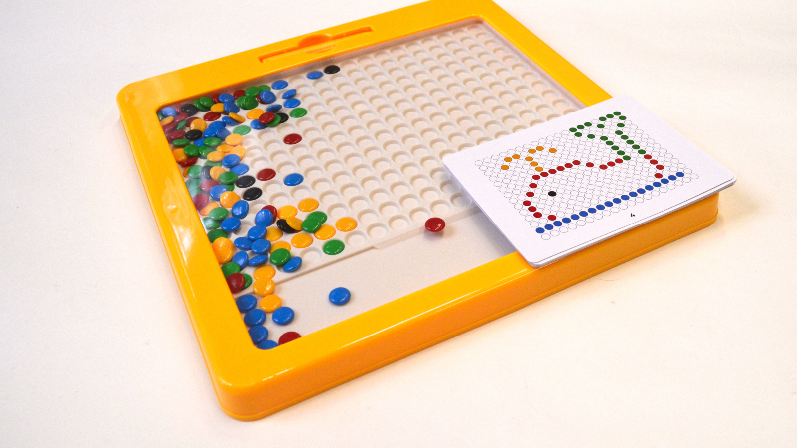 Gebruik de magnetische pen om kleurrijke schijfjes te plaatsen volgens de patroonkaarten of ontwerp je eigen kunst!