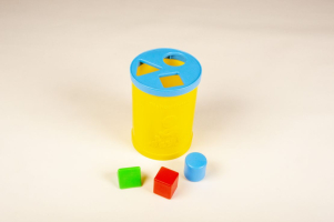 De gele pot van Fisher-Price is een klassieker. Deze is een iets recentere uitgave met 4 vormen.