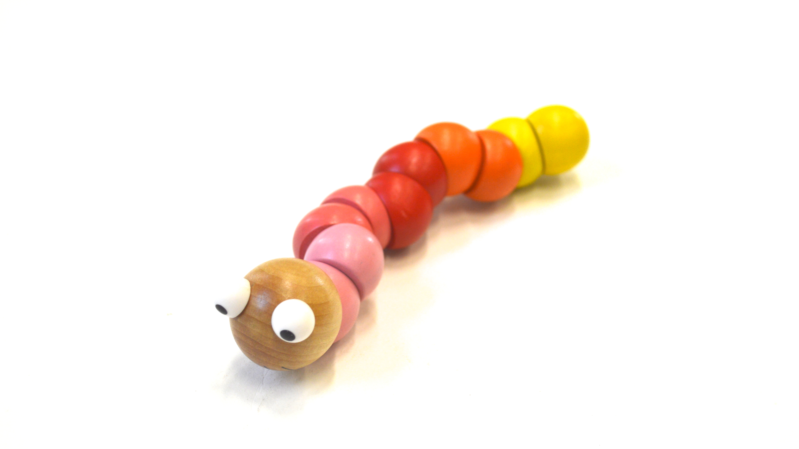 Het draaibare lichaam, de felle kleuren en de dikke kralen van de worm maakt het gemakkelijk om vast te houden en te trekken, waardoor de fijne motoriek en hand/oogcoördinatie wordt ontwikkeld.